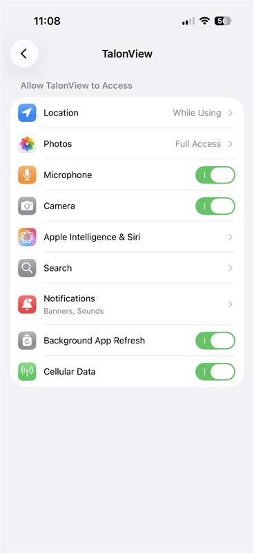 It is important to ensure all permissions are set accordingly for your mobile device. Without access to your camera, mic, and location, you may not have full functionality with Talon's live calling features or the ability to upload photos or videos within the mobile app.