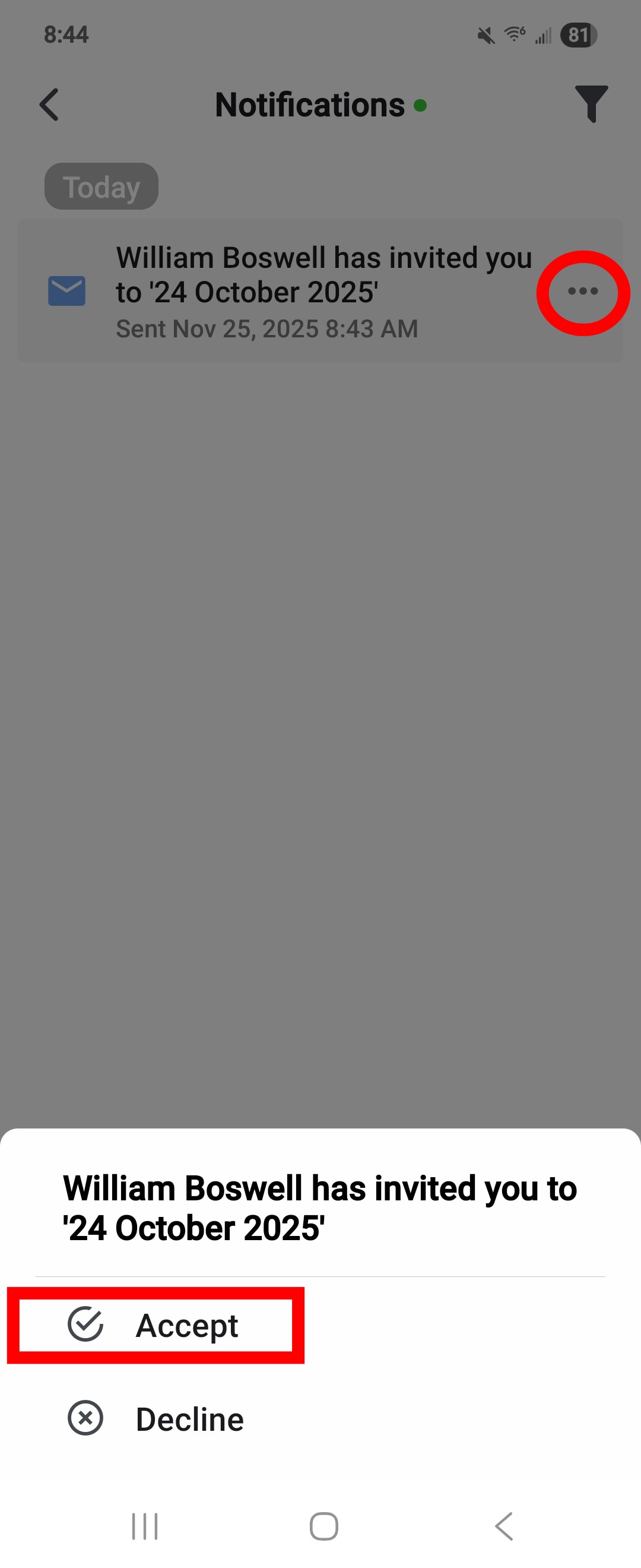 Step 6  You should see any new Invites to sessions here. Click the three dots to the right (...) and either Accept or Decline the invitation.