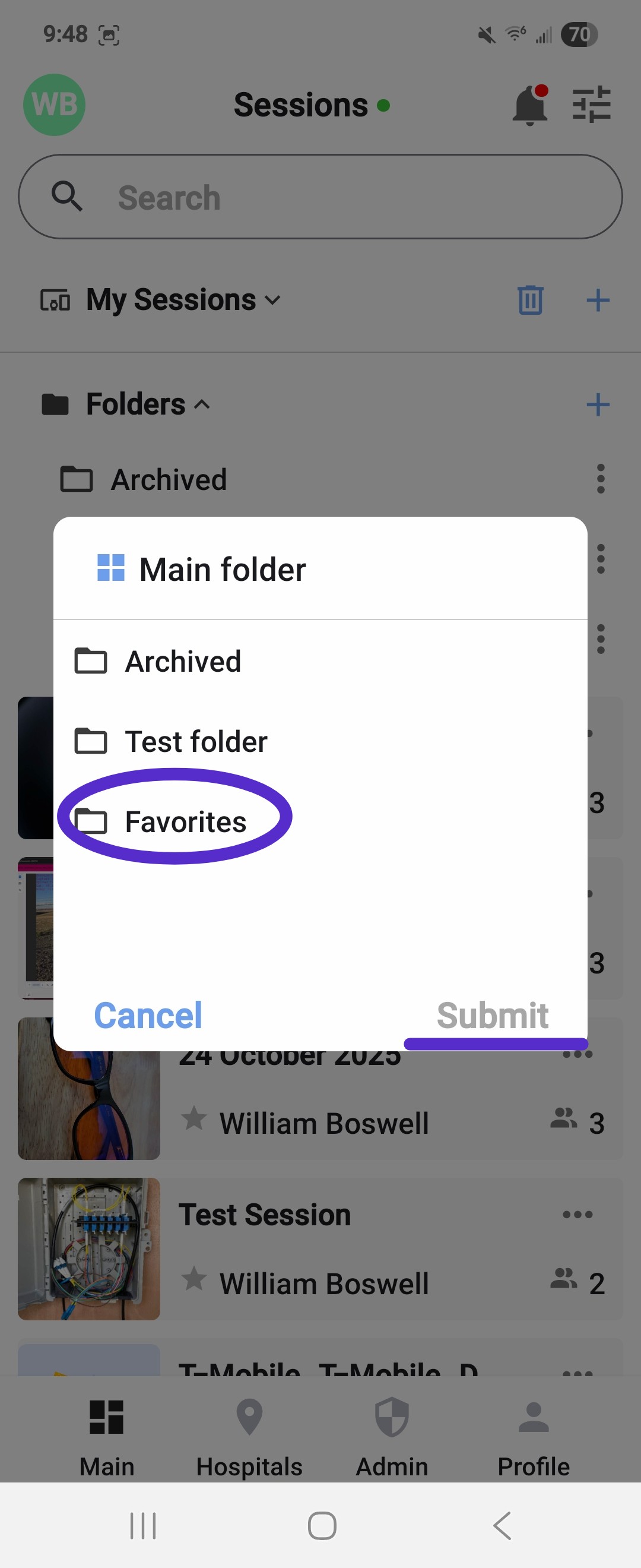 - Click submit to finish moving the session into that folder